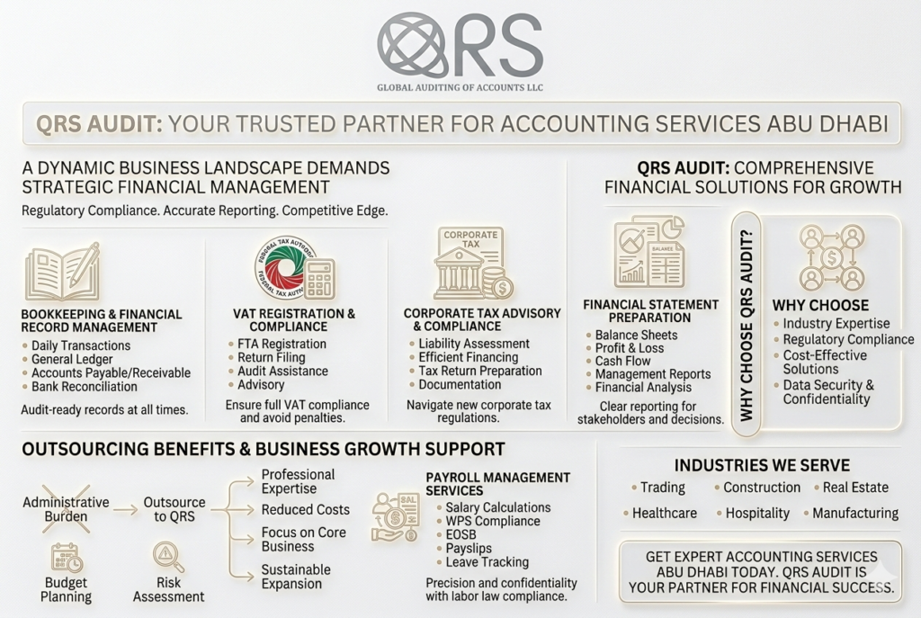 If you are looking for professional, accurate, and fully compliant Accounting services Abu Dhabi, QRS Audit is here to help. From bookkeeping and VAT filing to corporate tax advisory and payroll management, we provide comprehensive financial solutions tailored to your business needs.